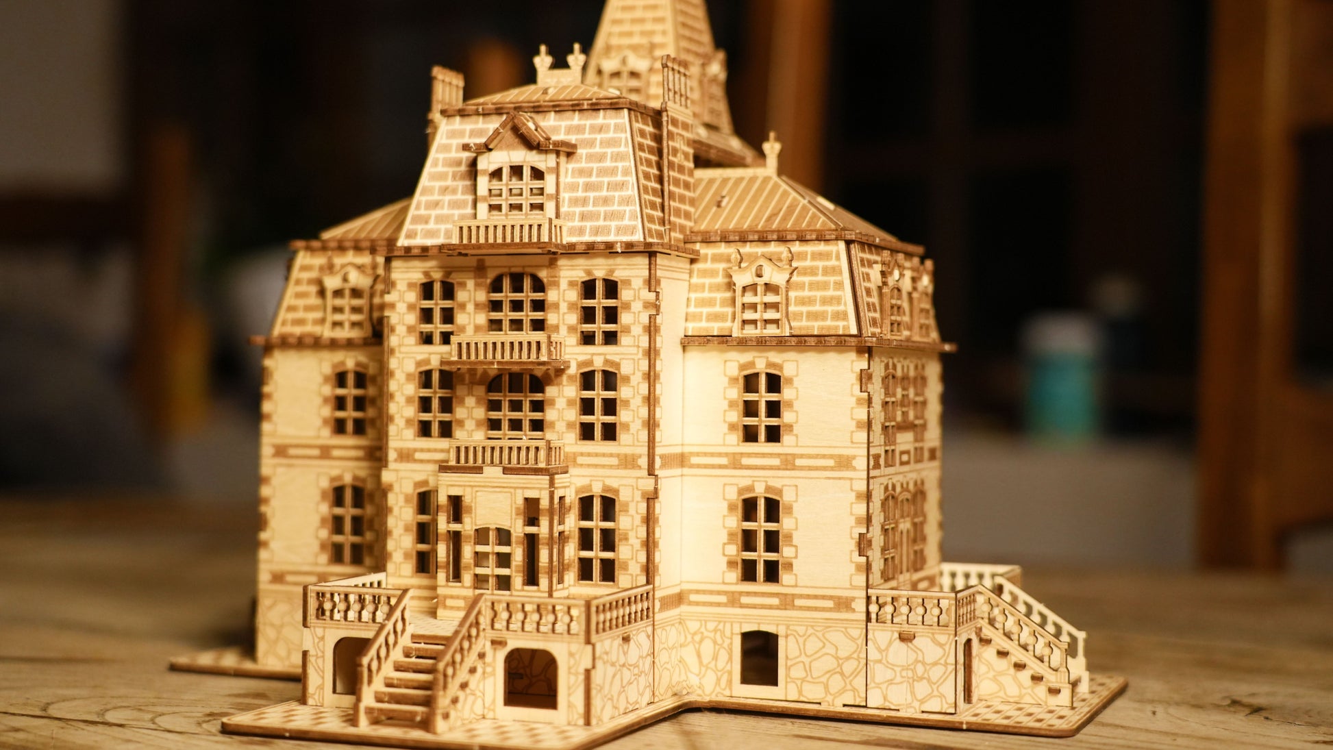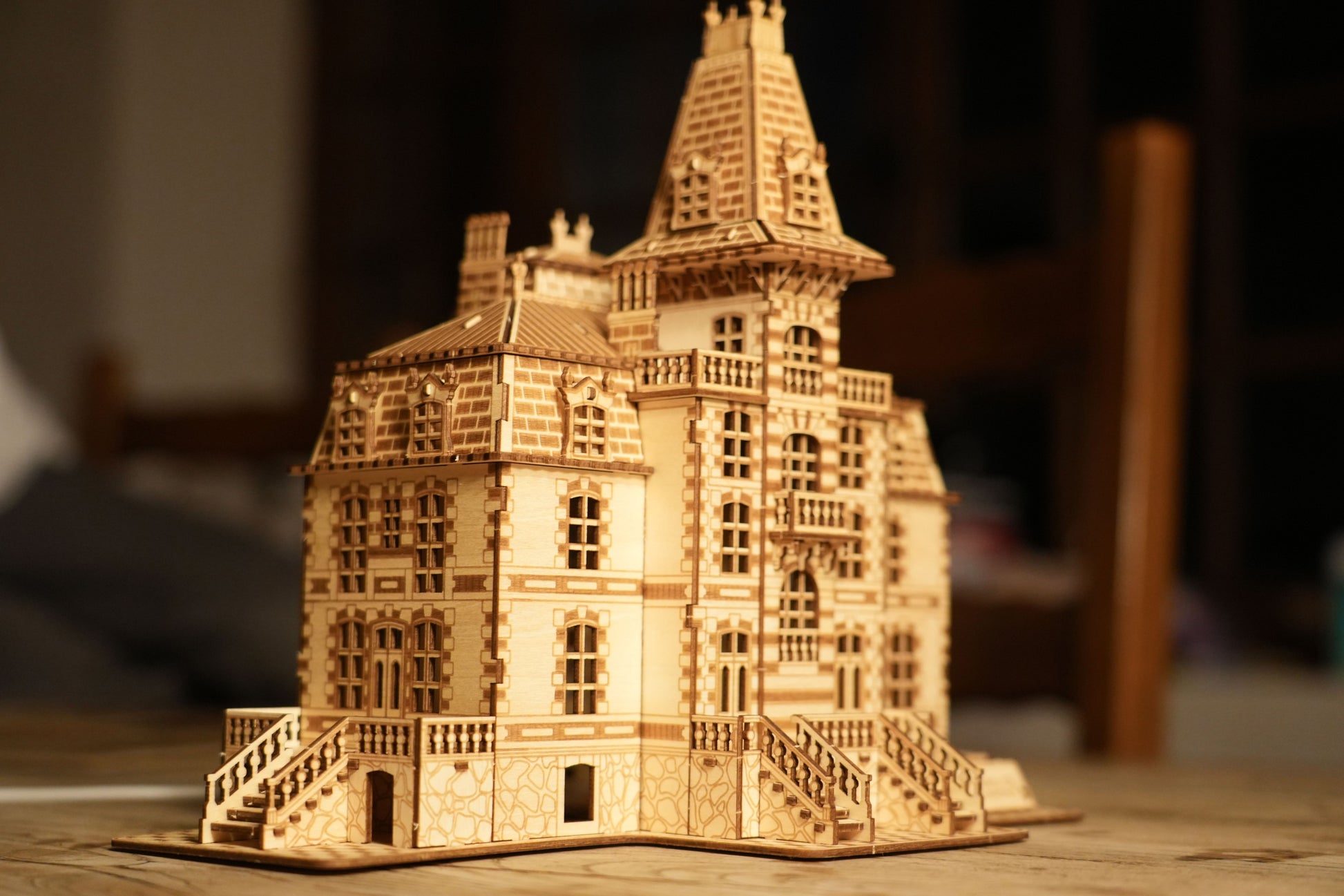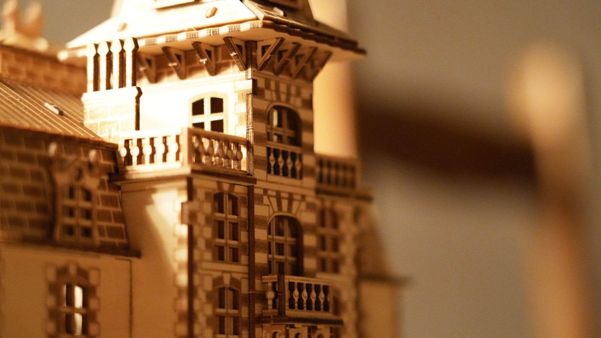 As you carefully slot together each piece, the château gradually rises before you, transforming from a flat sheet of wood into a stunning three-dimensional masterpiece. Once complete, the soft warm LED lighting brings the model to life, casting a gentle glow through its windows for a truly magical finish.